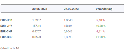 An den Finanzmärkten ergab sich im Sommerquartal ein Gesamtbild, das von Konsolidierung respektive leichter Korrektur der in Teilen bemerkenswerten positiven und widerstandsfähigen Lage (Aktienmärkte) im ersten Halbjahr 2023 geprägt war.