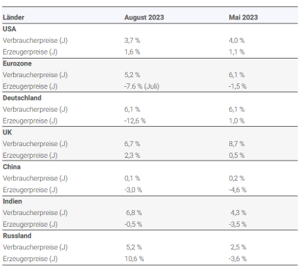 Die Entspannung des Inflationsdrucks im ersten Halbjahr setzte sich in der westlichen Welt im dritten Quartal 2023 nicht erwartungsgemäß fort. Dafür waren unter anderem Energiepreise verantwortlich. So legte der Preis der Ölsorte Brent seit dem 30. Juni 2023 von 74,81 USD auf 93,27 USD pro Fass um circa 25 % zu. Im Jahresvergleich kam es im Vergleich zum Ultimo September 2022 zu einem Anstieg um gut 5 %. Die Erdgaspreise nahmen im 3. Quartal im Quartalsvergleich in Europa um 15,5 % zu. Dagegen kam es in den USA bei Erdgaspreisen zu einem Rückgang im 3. Quartal 2023 um 5,4 %. An den Metallmärkten ergaben sich tendenziell eher entlastende Entwicklungen. So sank der Nickelpreis seit Ende des 2. Quartals 2023 um 5,7 %, der Kupferpreis fiel um 1,4 %. Der Aluminiumpreis stieg dagegen um 5,8 % (energieintensive Produktion, Korrelation zu Energiepreisen). Bei den Lebensmitteln war das Bild im 3. Quartal durchwachsen. Während die Preise gegenüber dem Ultimo des 2. Quartals bei Weizen (-4,3 %) und bei Schweinefleisch (-13,9 %) sanken, kam es bei Mastrind (+10,7 %), bei Zucker (+13,1 %) und bei Orangensaft (+32,1 %) beispielsweise zu Preiserhöhungen.